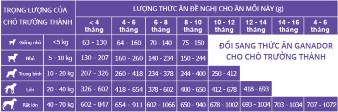 Hướng dẫn sử dụng: Cho ăn theo trọng lượng và độ tuổi của chó con. Vui lòng tham khảo bảng hướng dẫn trên bao bì.