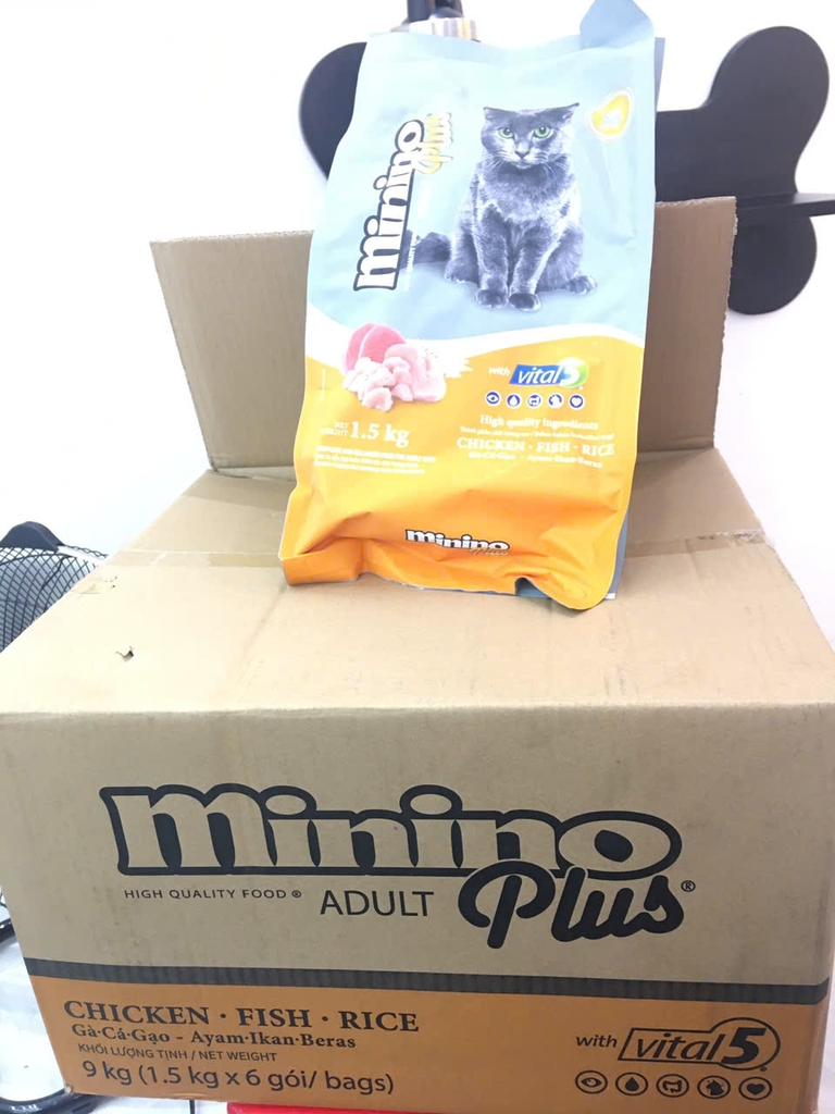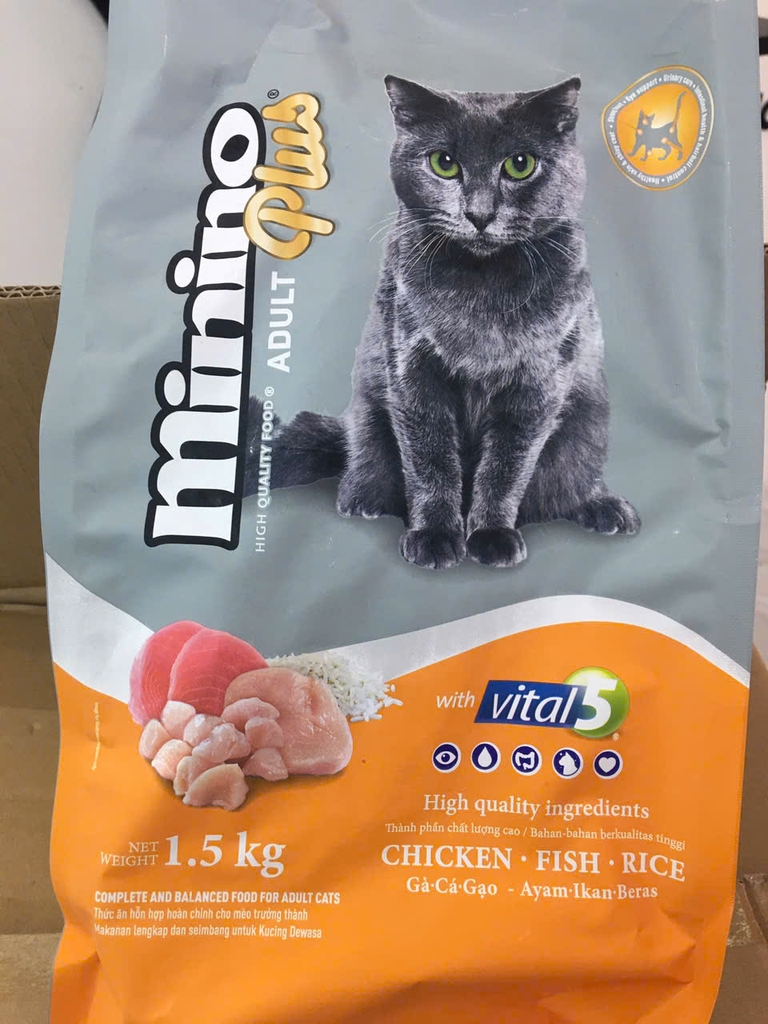 Minino Plus Vị Gà, Cá Và Gạo được bào chế với các thành phần chất lượng cao đảm bảo dinh dưỡng đầy đủ và cân bằng, đảm bảo sự phát triển khỏe mạnh trong suốt tuổi trưởng thành. Công thức của nó chứa hệ thống các lợi ích dinh dưỡng Vital 5.